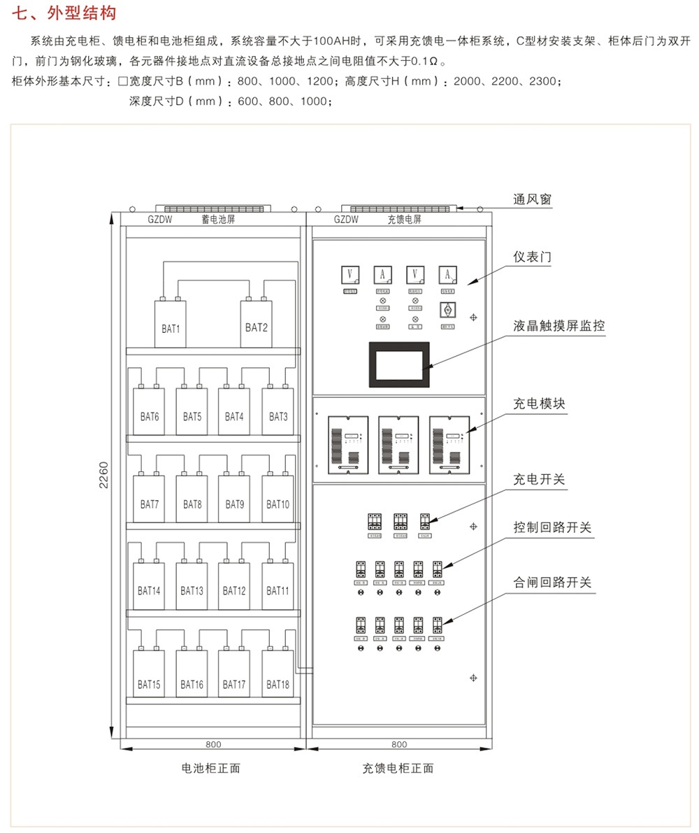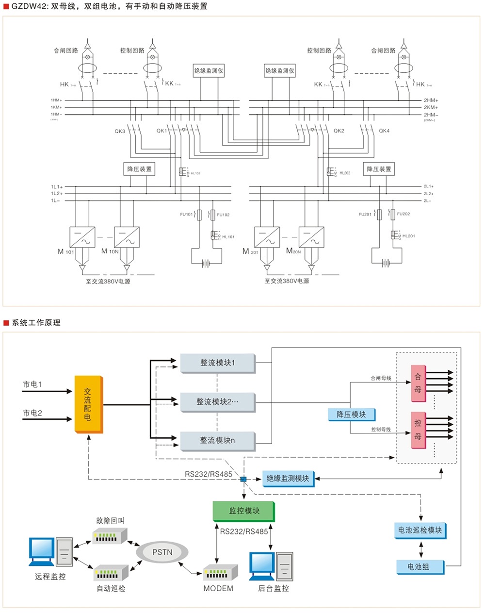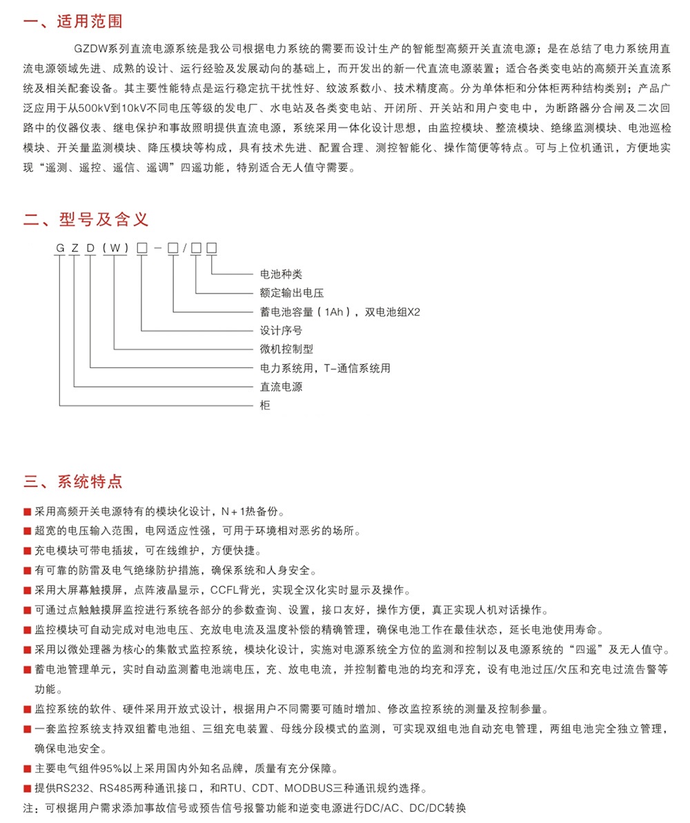 GZDW系列直流電源系統(tǒng)是我公司根據(jù)電力系統(tǒng)的需要而設(shè)計(jì)生產(chǎn)的智能型高頻開(kāi)關(guān)直流電源;是在總結(jié)了電力系統(tǒng)用直流電源領(lǐng)域先進(jìn)、成熟的設(shè)計(jì)、運(yùn)行經(jīng)驗(yàn)及發(fā)展動(dòng)向的基礎(chǔ)上,而開(kāi)發(fā)出的新一代直流電源裝置;適合各類(lèi)變電站的高頻開(kāi)關(guān)直流系統(tǒng)及相關(guān)配套設(shè)備。其主要性能特點(diǎn)是運(yùn)行穩(wěn)定抗干擾性好、紋波系數(shù)小、技術(shù)精度高。分為單體柜和分體柜兩種結(jié)構(gòu)類(lèi)別;產(chǎn)品廣泛應(yīng)用于從500KV到10kV不同電壓等級(jí)的發(fā)電廠、水電站及各類(lèi)變電站、開(kāi)閉所、開(kāi)關(guān)站和用戶變電中,為斷路器分合閘及二次回路中的儀器儀表、繼電保護(hù)和事故照明提供直流電源,系統(tǒng)采用一體化設(shè)計(jì)思想,由監(jiān)控模塊、整流模塊、絕緣監(jiān)測(cè)模塊、電池巡檢模塊、開(kāi)關(guān)量監(jiān)測(cè)模塊、降壓模塊等構(gòu)成,具有技術(shù)先進(jìn)、配置合理、測(cè)控智能化、操作簡(jiǎn)便等特點(diǎn)??膳c上位機(jī)通訊,方便地實(shí)現(xiàn)“遙測(cè)、遙控、遙信、遙調(diào)”四遙功能,特別適合無(wú)人值守需要。